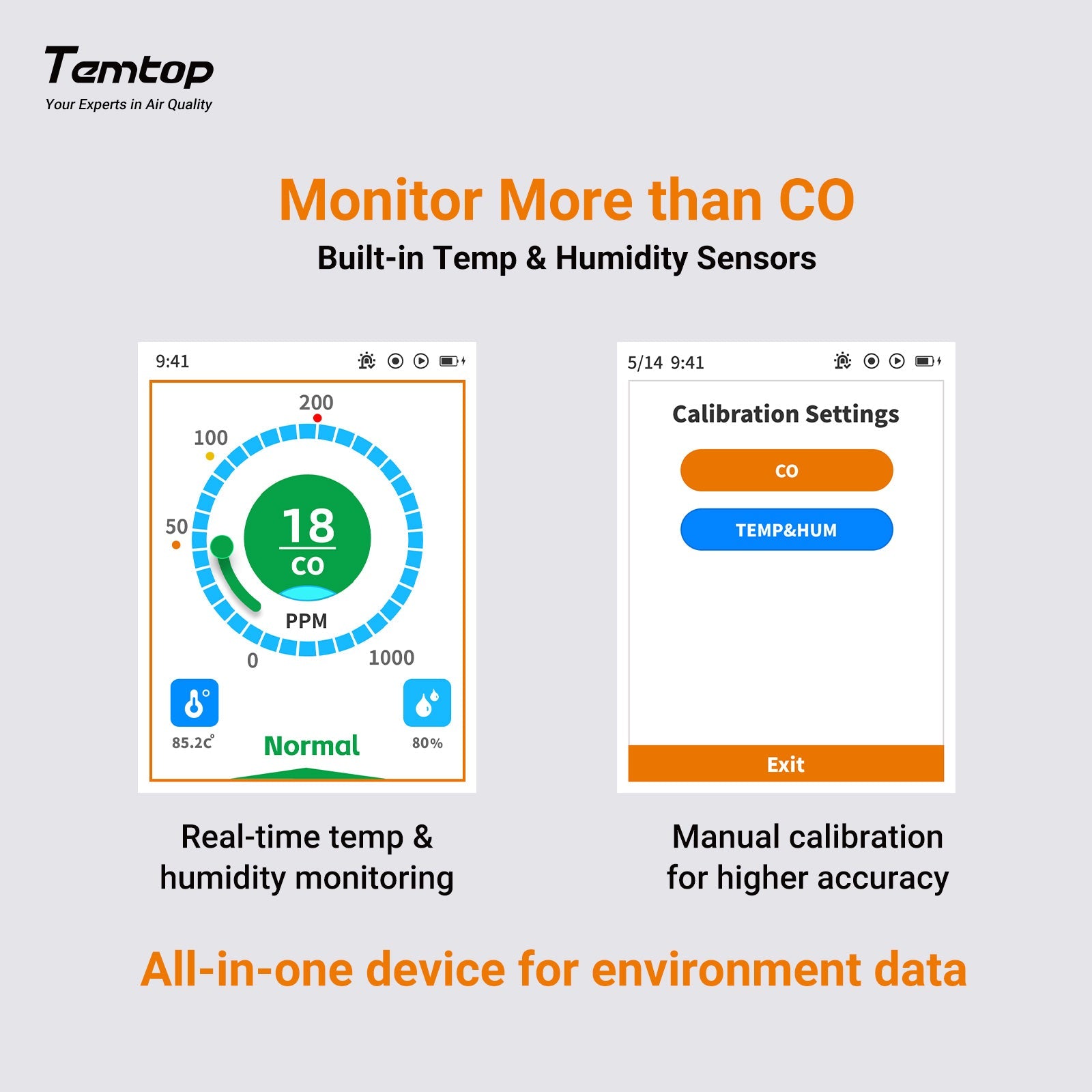 - Long Battery Life & Easy Calibration: Features a long-lasting 3000mAh battery for up to 50 hours of continuous use and supports simple calibration for CO, temperature, and humidity.
